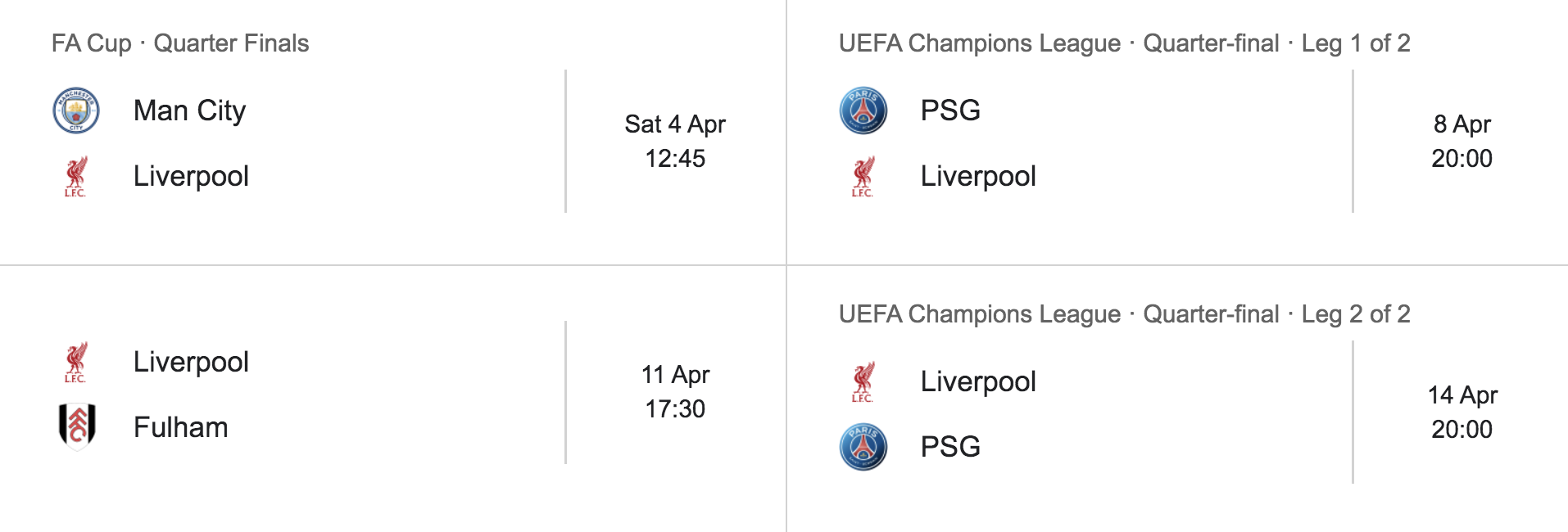 - Rabu 8 April: PSG v Liverpool (Liga Champions)