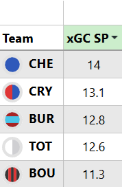 Bagian bawah tabel untuk set-piece xG kebobolan (xGC SP, atas), mereka membiarkan upaya bola mati lainnya untuk mencetak gol pada hari Sabtu.
