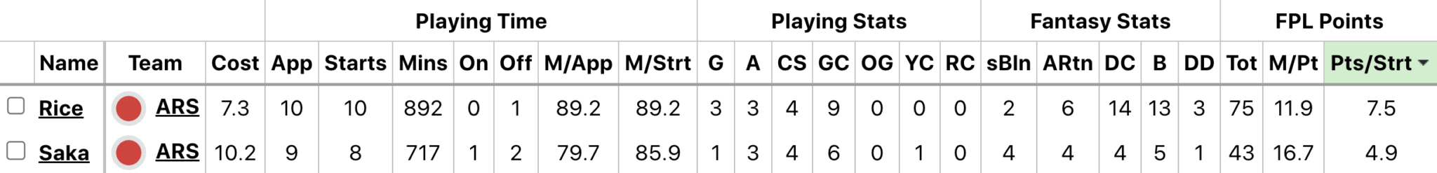 Di tempat lain, representasi penyerang dari Arsenal tampaknya mungkin terjadi – tapi siapa? Tampaknya ini adalah pilihan di antara keduanya Bukayo Saka (£10,2 juta) dan Nasi Declan (£7,3 juta). Yang pertama telah mencatatkan pengembalian serangan dalam delapan dari 11 Pekan Pertandingan terakhir, tetapi Rice lebih murah dan sebenarnya rata-rata mencetak lebih banyak poin per permulaan laga tandang (7,5/4,9) sepanjang musim sejauh ini: